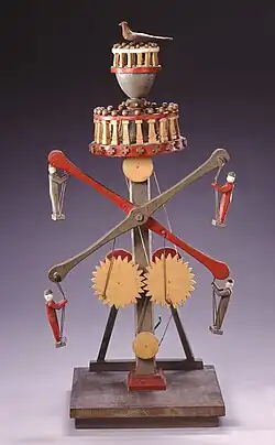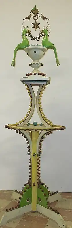 Scholl only started his woodworking after retiring at the age of eighty and he enjoyed making his wood sculptures. He created forty-five known pieces, some of them were large sculptures, while others were smaller like toys, and small puzzles. His carpentry skills influenced his woodwork with Victorian architecture design features like spindles and gingerbread brackets, he also used bright colors like mustard yellow, white, soft blue, and green that were once popular exterior colors of homes in the late 1800s. Many of his works included wooden wheels of fortune that were often seen at American carnivals and events after the 1900s. Sometimes when the weather was nice Scholl would take his woodworks out of his barn and bring them outside, around 1907 he began to hold viewing tours and much of the local community enjoyed his work. Scholl died on 26 February 1916 at 6pm at his home from pneumonia which he contracted after shoveling snow.[3] He was buried on 29 February 1916 at Germania Cemetery in Abbott Township, Pennsylvania.[4]