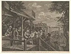 Nor did Shebbeare's own political friends altogether spare him. His sudden transition from pillory to pension was glanced at in The Expedition of Humphry Clinker, and he is the "Ferret" of Tobias Smollett's Adventures of Sir Launcelot Greaves. Shebbeare seems to have shared Johnson's dislike to Scotsmen. He criticised adversely Smollet's History, and assailed the "Scotch gentlemen criticks" of the Critical Review, then conducted by Smollett.[12] In the revised edition of the History, however, the passage relating to Shebbeare's prosecution in 1758 is curiously laudatory.[13] William Hogarth, also one of George III's pensioners, introduced Shebbeare as one of the figures in The Polling, the third work of his four-part Humours of an Election series (he is seen, a shackle on his leg, whispering into the ear of a mad man; in the later print version, he has a copy of the Sixth Letter in his pocket.[1]). Frances Burney met him in 1774 at the house of Catherine Reid, a Scottish portrait-painter, and has recorded a specimen of his conversation in her Early Diary. It was marked by extraordinary coarseness, and consisted chiefly of abuse of women and Scotsmen, whom he declared to be "the two greatest evils upon earth."[14]