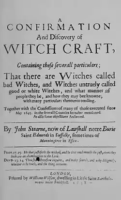 - ^ Davies, S.F (2007). The Discovery of Witches and Witchcraft: The Writings of the Witchfinders. Puckrel. ISBN 9780955635014.