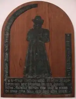 - Nathaniel (1579–1626), baptised at Hadleigh in 1579, died 1626 at Hutton, Somerset. Nathaniel married Jane Whitmore (died 1639, buried at Bath Abbey), a daughter of William Whitmore (died 1593), a haberdasher of Balmes Manor, Hackney[7] and of Apley Hall, Shropshire. Jane's nephew was Sir Thomas Whitmore, 1st Baronet (1612–1653).[8] They had a son who died young, and five daughters and co-heiresses: (1) Anne, born 1613, married to John Codrington of Codrington and Didmarton, Glos., to whose family passed the manor of Hutton, (2) Jane (born 1614) married Sir James Pyle of Compton Beauchamp, Berks, (3) Elizabeth (born 1618), living in 1639, (4) a fourth daughter unnamed; (5) Mary (born c. 1620) married to John Dennis (died 1660) of Pucklechurch, Glos., Sheriff of Gloucestershire and son of Henry Dennis (died 1638), who had married as his second wife Nathaniel's widow Jane. There is an incised stone mural tablet in a baroque surround in St Mary's Church at Hutton showing Nathaniel and his wife and children kneeling in prayer.