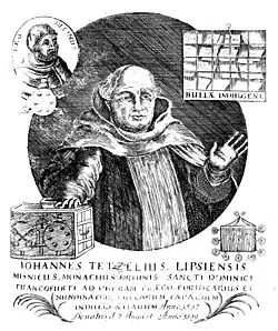 Tetzel was born in Pirna, Saxony, and studied theology and philosophy at Leipzig University. He entered the Dominican order[3] in 1489, became a famous preacher, and was in 1502 commissioned by Cardinal Giovanni de' Medici, later Pope Leo X, to preach the Jubilee indulgence, which he did throughout his life. In 1509 he was made an inquisitor of Poland and in January 1517 was made commissioner of indulgences for Archbishop Albrecht von Brandenburg in the dioceses of Magdeburg and Halberstadt.