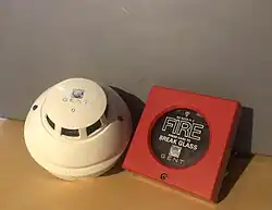 1995 saw the release of a new range of devices and panels.[4] Following the acquisition by Caradon, Gent released the 34000 series of devices for sale with both System 3400 and System 34000. These devices were much more compact and had a more modern design. Model codes were relatively similar with most just having a 0 appended to their 3400 equivalent (e.g. the 3480 MCP became the 34800). Others such as the 3420-02/03 loop-powered sounder became the 34202/3. 34000-era MCPs can be identified by their red lever mechanism which supports the break glass element as opposed to the black mechanism of 3400-era devices. This generation also introduced a control panel design that would stay around until the 2017 release of the Gent Vigilon Plus. The 34000 series was marketed as a more advanced system with the ability for more loops and some more features that the 32000 panel didn't have. In 2019 Gent announced that they were officially discontinuing the 34000 device range,[5] citing problems with part availability. To help upgrade unsupported systems, Gent released the 34000 S-Quad Adapter Base[6] (S4-700-34k), allowing S-Quad detectors to be installed onto Vigilon systems running 34000 loops quickly and easily, without having to replace the 34700 detector bases. The S-Quad adapter base is not compatible with the 19279-01 Semi flush mounting kit or the 19279-10 Sensor Trim Ring. If either of these trim rings are used, the 34000 base must be removed, the ceiling repaired (or replaced), and a regular S4-700 base, or an S4-FLUSH base installed. The S-Quad adapter base is also not supported for use with 34000, or older panels, citing compatibility only with Vigilon and Vigilon Plus. While these devices may work with these older panels, using them on these panels (especially with the S-Quad adapter base) is unsupported and issues can arise, especially with voice sounder models. One of the devices released in the 34000 range was the 34770 optical heat sounder (optical smoke and heat sensor with integrated sounder).