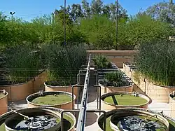 In the later 1990s, the design was modified to create an "advanced ecologically engineered system" (AEES). Large reductions in phosphorus, ammonia, and iron occurred between 1999 and 2001.[10]: 65–66 [5][55][41]: 9–10 [38] Beginning in June 2001, the original structure was replaced with the first large-scale wastewater application of floating AEES Restorers. Twelve Restorers are arranged across the lagoon, in a pattern designed to promote a serpentine water flow. The installation incorporates 25,000 plants from 25 native species to remediate waste.[5]