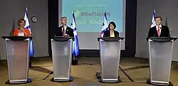 Tory on stage with other mayoral candidates prior to a debate, June 2014