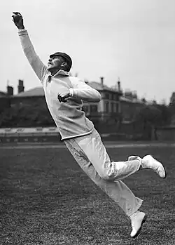 Almost as important to Yorkshire as his batting was Tunnicliffe's slip fielding. Nicknamed "Long John of Pudsey", he had long arms that enabled him to bring off catches others would not have attempted. In 498 first-class matches, he took 695 catches.[3] In a few of his early games in 1891 and 1892, he appeared to have acted as wicket-keeper, but thereafter he was at slip. His 70 catches in the 1901 season was a record that stood until Wally Hammond caught 79 in 1928. His ratio of catches to matches is 1.393:1, which compares favourably with both Hammond (1.291:1) and John Langridge (1.365:1).
