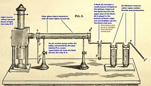 - In the lab he came up with the following simple way to obtain "optically pure" air, i.e. air that has no visible signs of particulate matter. He built a square wooden box with a couple of glass windows on it. Before closing the box, he coated the inside walls and floor of the box with glycerin, which is a sticky syrup. He found that after a few days' wait the air inside the box was entirely particulate-free when examined with strong light beams through the glass windows. The various floating-matter particulates had all ended up getting stuck to the walls or settling on the sticky floor.[34] Now, in the optically pure air there were no signs of any "germs", i.e. no signs of floating micro-organisms. Tyndall sterilised some meat-broths by simply boiling them, and then compared what happened when he let these meat-broths sit in the optically pure air, and in ordinary air. The broths sitting in the optically pure air remained "sweet" (as he said) to smell and taste after many months of sitting, while the ones in ordinary air started to become putrid after a few days. This demonstration extended Louis Pasteur's earlier demonstrations that the presence of micro-organisms is a precondition for biomass decomposition. However, the next year (1876) Tyndall failed to consistently reproduce the result. Some of his supposedly heat-sterilized broths rotted in the optically pure air. From this Tyndall was led to find viable bacterial spores (endospores) in supposedly heat-sterilized broths. He discovered the broths had been contaminated with dry bacterial spores from hay in the lab. All bacteria are killed by simple boiling, except that bacteria have a spore form that can survive boiling, he correctly contended, citing research by Ferdinand Cohn. Tyndall found a way to eradicate the bacterial spores that came to be known as "Tyndallization". Tyndallization historically was the earliest known effective way to destroy bacterial spores. At the time, it affirmed the "germ theory" against a number of critics whose experimental results had been defective from the same cause. During the mid-1870s Pasteur and Tyndall were in frequent communication.[35][36]