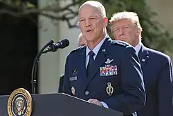 On December 20, 2019, the U.S. Space Force was established by redesignating the Air Force Space Command as a separate service. Raymond, then commander of Air Force Space Command, was appointed as the first chief of space operations. According to President Donald Trump, "With today's signing I will proudly appoint Gen. Jay Raymond the first chief of space operations and he will become the very first member of the Space Force and he will be on the Joint Chiefs."[33] By becoming the first member of the Space Force, he left the Air Force after over 35 years of military service. He was officially sworn in by Vice President Mike Pence on January 14, 2020.[34]