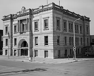 - Grand Forks City Hall, 404 N. 2nd Ave., Grand Forks, ND (Ross, John W.)[6] This building "is pure Beaux Arts. Rather small in scale and only two storys over a raised basement, the City Hall is faced with ashlar and was similar in mass, style, and materials to the recently razed Carnegie Library which was located nearby."[7]: 5