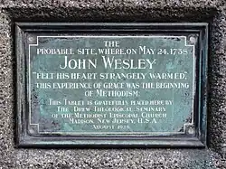 "In the evening I went very unwillingly to a society in Aldersgate Street, where one was reading Luther's Preface to the Epistle to the Romans. About a quarter before nine, while he was describing the change which God works in the heart through faith in Christ, I felt my heart strangely warmed. I felt I did trust in Christ, Christ alone for salvation, and an assurance was given me that he had taken away my sins, even mine, and saved me from the law of sin and death."[34]