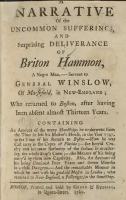 - ^ "Briton Hammon. A Narrative of the Uncommon Sufferings, and Surprizing Deliverance of Briton Hammon, a Negro Man,--Servant to General Winslow, of Marshfield, in New-England; Who Returned to Boston, After Having Been Absent Almost Thirteen Years. Containing". UNC University Library. Retrieved 21 October 2010.