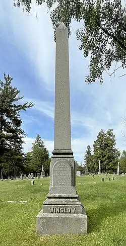 On October 18, 1827, Winslow married Betsey Collins. They had five children, Bradley, Norris, Betsey, Lucy, and Jennie.[1] Collins died in 1843. John remarried to Sarah Bates on May 23, 1844. The couple had one son. John Winslow died on July 7, 1874,[2] in the city of Watertown from congestion.[4] He was buried in Brookside Cemetery in Watertown, New York.[4]