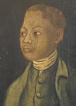 John's arrival in Ystumllyn was marked by his knowledge of "no language other than sounds similar to the howling of a dog", in Jones' words;[5]: 5 this was likely a West African language, unfamiliar to the Welsh locals.[1] Jones speaks of the locals "domesticating" Ystumllyn, meeting with "considerable difficulty for a long time", first keeping him indoors, and – with the help of local women – teaching him fluency and literacy in both Welsh and English. Ystumllyn was then put in the garden, where he showed a gift for crafts and horticulture, and developed a fondness for floristry.[4][5]: 5 According to Tom Morris, "it was remarked that this very black skin had very green fingers".[10] He found employment on the Ystumllyn estate as a gardener, for what Morris reported was very low pay, his upkeep being "less costly than that of a racehorse".[10] On 11 May 1754, he sat for his oil painting, at which time Jones estimated he was aged around sixteen.[4][5]: 5