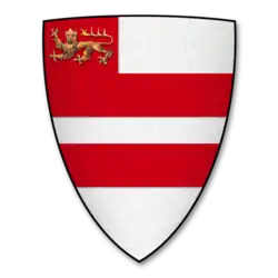 The blazonry attributed to John de Lancastre at Caerlaverock: "Argent (silver), two bars gules (red), with a canton or quarter of gules, with a lion, passant guardant (a "leopard") in it, coloured or (gold or yellow)"