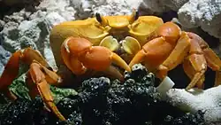 Johngarthia oceanica, also known as Clipperton crab, is a bright orange species of land crab that lives on Clipperton Island and on Socorro Island in the Revillagigedo Islands off Mexico in the tropical eastern Pacific.[1] Prior to 2019, J. oceanica was considered part of J. planata,[2][3] however a reexamination determined the land crabs on the oceanic islands to be a separate species. J. oceanica differs from J. planata in the shape of the mesial lobe of the infraorbital margin and the color of its carapace.[1]