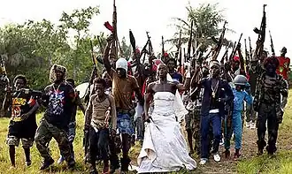 The teenage rebel Johnny Mad Dog leads the small group of younger boys commanded by the older General Never Die, who feeds them cocaine.[2] The film follows the group's march towards the capital Monrovia in a gritty realistic manner as they move through a series of towns and villages, where they terrify and often execute the population. The soldiers are depicted as almost feral, committing acts of pillage and rape, with scant regard for even their own lives.[3] They wear a variety of outlandish outfits – including butterfly wings and a wedding dress – and have nicknames such as No Good Advice, Captain Dust to Dust, and Chicken Hair.[4]