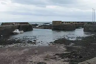 By 1847 the natural inlet near the village had been protected by "high water rocks" deposited to offer protection[6]. Not until 1871 was the first harbour created: the enclosed area now to the north side. This was adapted in 1884 creating a breach in the southern breakwater to create an inner harbour, and only this double barrier offered Johnshaven protection from the harsh North Sea to which it is highly exposed. Due to multiple rocks flanking the harbour entrance, the harbour is frequently hazardous in bad weather.[7]
