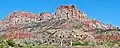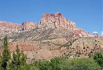 Johnson Mountain is located immediately southeast of Springdale, towering 2,200 feet (670 meters) above the town and the floor of Zion Canyon. It is wedged between the North and East Forks of the Virgin River which drain precipitation runoff from this mountain. Its nearest higher neighbor is The Watchman, 0.8 mi (1.3 km) to the north-northeast, and Mount Kinesava is positioned 2.94 mi (4.73 km) directly across the canyon to the northwest.[1] Shunesburg Mountain is set 2 mi (3.2 km) to the southeast, directly across the mouth of Parunuweap Canyon. This feature's name was officially adopted in 1934 by the U.S. Board on Geographic Names. It is named for Nephi Johnson (1833–1919), a Mormon missionary, interpreter, explorer, and the first white man to visit Zion Canyon.[3] In 1858 a Paiute guide by the name of Nauguts led Nephi into the Zion Canyon area of the upper Virgin River.[4] Johnson wrote a favorable report about the agricultural potential of the upper Virgin River basin, where he founded the town of Virgin.