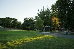 Looking south west at Johnson Park towards the picnic rotunda and playground.