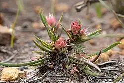 Johnsonia acaulis is a rhizomatous, tufted, perennial herb with grass-like leaves 55–165 mm (2.2–6.5 in) long. The flowering scape is red or green, with floral bracts 6.5–11.5 mm (0.26–0.45 in) long and 4–7 mm (0.16–0.28 in) wide. The perianth is 3–4 mm (0.12–0.16 in) long and white, pink or green, and the sepals and wider than the petals. The anthers and the style are about 2 mm (0.079 in) long. Flowering occurs from August to December and the fruit is a capsule 2–4 mm (0.079–0.157 in) long.[2][3]