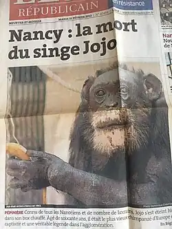 Jojo died from an ulcer during the night of 19 to 20 February 2012. He was then 60 years old, making him the oldest chimpanzee in Europe.[3] His death moved the Nancy population, which had been marked for generations by the presence of the animal. In a statement, the city of Nancy declared that "Jojo was the memory of a certain way of presenting wild animals now abandoned".[4]