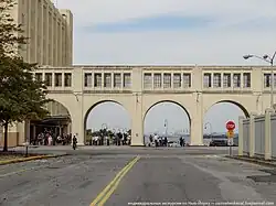 Arkham State Hospital is based on Arkham Asylum.[36] Warner Bros. Korea explained that it is a more realistic name in the real world.[113] The exterior of Arkham State hospital was filmed at Brooklyn Army Terminal,[114] while the interior was pictured in Metropolitan Hospital Center of Harlem.[115] Throughout the film, two walls are shown inside Arkham State Hospital; one is clearly white in the first and last scenes, the other is dirty yellow in the scene in which Arthur runs with a medical report. This difference was intended to make the audience confused and to question the possibility that Arthur had been in hospital the entire time.[36][113]