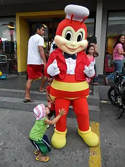 Introduced in 1980, Jollibee is a large anthropomorphic bee mascot dressed in a red blazer, shirt, and chef's hat.[59] Jollibee's design is based on Mickey Mouse.[12] The mascot was designed to epitomize Filipino optimism. Tony Tan, Jollibee's founder, has compared the mascot's character to the Filipino working class, stating that the bee "hops around and produces sweet things for life, and is happy even though it is busy".[60] Jollibee developed additional mascots, some of which were featured in Jollitown, a children's show aired in the Philippines.[12]