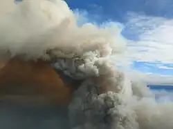 On August 29, Kittitas County declared a state of emergency,[9] and pyrocumulus clouds were visible on satellite images of the Cascades.[10] On the same day, the Washington Military Department's Emergency Operation Center at Camp Murray was activated in response to Jolly Mountain.[11] Smoke continued to affect visibility and air quality in Seattle on August 30, and air quality in Kittitas County was officially termed "unhealthy".[12][13] The fire grew rapidly August 30–31 due to winds.[6]