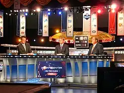 In May 2009, Gruden was hired by ESPN to serve as a color analyst on its Monday Night Football telecasts, replacing Tony Kornheiser.[99] He also served as an analyst for ESPN's coverage of the NFL draft and postseason college football games, helping to call the 2010 Rose Bowl and 2010 BCS National Championship Game on ESPN Radio and the 2011 Outback Bowl and 2011 Orange Bowl on ESPN. In the spring of 2012, Gruden became the focus of the series Jon Gruden's QB Camp, where he went over the NFL development process with prospective NFL draftees at quarterback, including Andrew Luck and Robert Griffin III. During the Monday Night Football broadcast, Gruden gave out a weekly award called the "Gruden Grinder" to the best player in the game that week.[100]