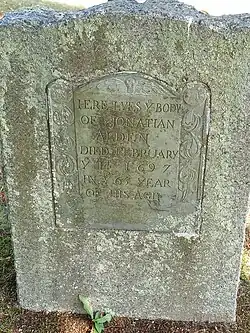 Jonathan Alden died on February 14, 1697, in Duxbury, leaving an estate of £309 (about US$67,500 in 2022).[18][19] He was given a military funeral and "buried under arms." He was interred near his parents in Myles Standish Burial Ground, the oldest maintained cemetery in the United States.[20][21]