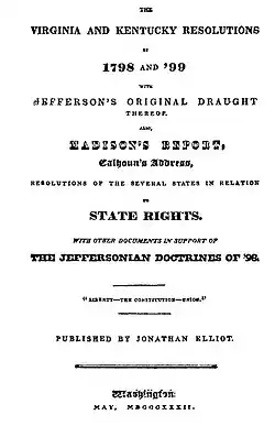 - ^ "The Virginia and Kentucky resolutions of 1798 and '99 : with Jefferson's original draught thereof. Also, Madison's report, Calhoun's address, resolutions of the several states in relation to state rights. With other documents in support of the Jeffersonian doctrines of '98."