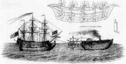 The protection of his invention by Hulls depended on the financial support of his neighbour named Freeman at Batsford Park.[1] The patent for the invention by Hulls is dated 21 December 1736, and his account of it appeared as Description and Draught of a new-invented Machine for carrying Vessels or Ships out of or into any Harbour, Port, or River against Wind and Tide, or in a Calm; for which his Majesty has granted Letters-patent for the sole benefit of the Author for the space of fourteen years (London, 1737). It was reprinted in facsimile in 1855.[3]