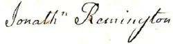 Jonathan Remington (1677–1745), was an Associate Justice of Massachusetts Superior Court of Judicature appointed by Gov. Jonathan Belcher. Judge Remington married Lucy Remington Bradstreet (1680–1743), a granddaughter of Gov. Simon Bradstreet. Their daughter Ann Remington (her first name is also spelled "Anne") was the first wife of William Ellery, a signer of the United States Declaration of Independence.[1]