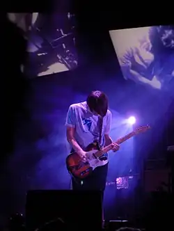 Radiohead's second album, The Bends (1995), brought them significant critical attention.[24] Greenwood said it had been a "turning point" for Radiohead: "It started appearing in people's [best of] polls for the end of the year. That's when it started to feel like we made the right choice about being a band."[25] On tour, Greenwood damaged his hearing and wore protective ear shields for some performances.[26]