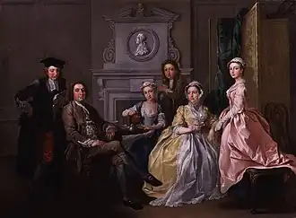 The first major event Tyers organised at the gardens was on 7 June 1732.[4] Styled as a Ridotto al Fresco – a ridotto in Italy was a fancy-dress ball held outside[7] – 400 visitors paid the one guinea entrance charge.[4] Frederick, Prince of Wales, who owned the land the gardens were on, was among the paying visitors.[4] The entertainment on offer was advertised as scenes portraying pieces entitled "The House of Ambition", "The House of Avarice", "The House of Bacchus", "The House of Lust" and "The Palace of Pleasure".[4] But the moralistic undertones of the presentations were a disappointment to their audiences; the next ridotto, staged a fortnight later, was poorly attended and a financial disaster.[4] Shortly after the second ridotto, the artist William Hogarth, who had an apartment near to the gardens at South Lambeth,[8] found his friend Tyers in a depressed state trying to decide whether it was better to commit suicide by drowning or hanging himself.[4] Hogarth's artworks were satires designed to communicate a moral lesson in a humorous manner[9] and he suggested Tyers should use similar methods to educate those seeking entertainment at the Gardens.[4] As an art collector with diverse interests Tyers already had a wide variety of friends in the artistic community and he commissioned several artists including Francis Hayman, – who Tyers later employed as his artistic director, a role he held for thirty years[4] – Hubert-François Gravelot, Louis-François Roubiliac as well as Hogarth to undertake the task of transforming the gardens.[1] The venue and its entertainments were promoted as being family friendly, yet to retain his profit margins Tyers ensured some areas remained unlit for the benefit of the sex workers.[10]