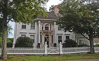 The Jonathan Warner House is located in a rural-suburban area of eastern Chester, at the northeast corner of East King's Highway and Middlesex Turnpike (Connecticut Route 154). It is a two-story wood-frame structure, five bays wide, with a side-gable roof, two interior chimneys, and clapboarded exterior. The central bay of the front is framed by two-story Ionic pillars supporting a small flat projecting roof. The main entrance is flanked by pilasters supporting an entablature, and sidelight windows outside the pilasters. It has a Palladian window above the entry with pilasters separating and flanking the window sections. A 19th-century carriage barn, which was moved to the site, serves as the garage. The interior of the house has many instance of fine woodwork, including several original fireplace mantels, and the main staircase.[2]