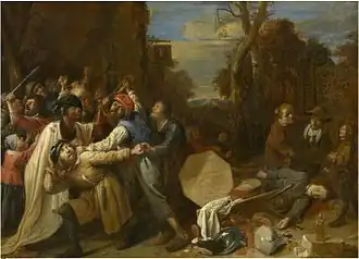 Joos van Craesbeeck[1] (c. 1605/06 – c. 1660) was a Flemish baker and a painter who played an important role in the development of Flemish genre painting in the mid-17th century through his tavern scenes and dissolute portraits. His genre scenes depict low-life figures as well as scenes of middle-class people.[2] He created a few religiously themed compositions.[3]