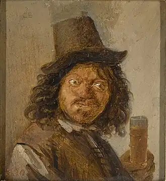 Many of his tronies are in fact self-portraits. He painted at least five presumed self-portraits in which he depicts himself in a 'dissolute' manner. The dissolute self-portrait was a form of self representation of artists that arose in Dutch and Flemish genre painting in the 17th century. It was an inversion of the Renaissance ideal of the 'pictor doctus', which regarded the artist as an intellectual and gentleman. This ideal was replaced by the new model of the prodigal artist characterized by his creative inspiration and talents. These self-portraits aimed to emphasize the artists' dissolute nature by creating associations with traditional moral themes such as the Five Senses and the Prodigal Son in the tavern. Van Craesbeeck painted himself four times in low-life guises. These self-portraits can also be regarded as tronies, since they depict the artist with exaggerated expressions, and often represent one of the five senses.[6]