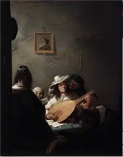 An example is the Lute Player (Liechtenstein Museum), which shows two women entertaining a cavalier, who seems to have passed out with a full glass of wine in front of him. A flute hanging above the head of an old man leaning over the shoulder of the female lute player symbolises the man's thoughts. Van Craesbeeck modernized the pattern introduced by the Caravaggisti of showing figures seated around a table with those in front shown in silhouette by more full describing the interior space, showing the effect of the daylight and opting for a more vertical format.[2]