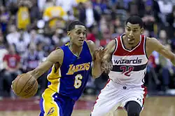 On June 26, 2014, Clarkson was selected with the 46th overall pick in the 2014 NBA draft by the Washington Wizards. He was later traded to the Los Angeles Lakers on draft night for cash considerations,[16][17] and joined the team for the 2014 NBA Summer League.[18] On August 25, 2014, he signed with the Lakers.[19] During his rookie season, he received multiple assignments to the Los Angeles D-Fenders of the NBA Development League,[20] and did not play for the Lakers for most of the first half of the season. However, he ended up starting 38 games for the Lakers, primarily at point guard, and averaged 15.8 points, 5.0 assists, and 4.2 rebounds as a starter.[21] On March 24, 2015, he had a season-best game with 30 points and 7 assists in a loss to the Oklahoma City Thunder.[22] Starting alongside Jeremy Lin, the pair became the first Asian-American starting backcourt in league history.[23] On March 30 and April 1, Clarkson recorded back-to-back double-doubles. For the season, he was named to the NBA All-Rookie First Team.[21] In the prior 30 years, there had been only four other second-round picks that were named to the first team.[24] Clarkson after joining the Lakers garnered a huge following in the Philippines owing to his Filipino heritage and the existing fanbase of the NBA team in the country.[25]