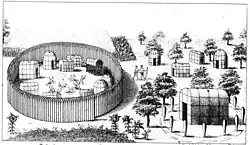 Though the area around Jordan Point had been occupied by native Americans for millennia, archeologists have found evidence of settled agricultural settlements that date from the late Woodland and English-Native American Contact periods, dating between 1150 and the early 1600s.[2] The archaeological findings suggest that during the Contact period, the area had become a village occupied by the lower orders of the Powhatan chiefdom with the structures conforming to Robert Beverley's description of bark covered buildings,[3] the smaller being shaped like beehives and larger having an oblong form.[2] John Smith and William Hole's copper plate engraved map of Virginia shows that the village at Jordan's Point was still extant in 1607,[4][5] when the first English settlers arrived at Jamestown.