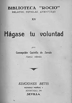 In 1915[7] Zavala Lara married Concepción Castella y García Duarte (1889–1966), an Andalusian girl from Baena (Cordoba province); she was daughter to an established bourgeoisie family[8] and granddaughter to Eduardo García-Duarte, professor of medicine and rector of the Granada University.[9] The couple shuttled across Spain and Morocco following military assignments of Zavala Lara, including Larache (1916),[10] Seville (1920),[11] Granada (1922),[12] Guadalajara (1923),[13] again Seville (1929),[14] again Larache (1932),[15] Canary Islands (1932)[16] and Burgos (1935).[17] Zavala Lara rose to the rank of farmacéutico mayor.[18] When he retired in 1939,[19] his wife became sort of a public figure. In 1936–1950 and as Concepción Castella de Zavala she published some 15 novels;[20] currently viewed as second-rate literature, they combined action and romance with praise of traditional values and patriotic virtues.[21]