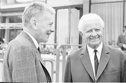 "If someone thinks we are manoeuvred by the Soviets, they are badly off base," said Smrkovský in the summer of 1968.[1] His assessment proved incorrect. The Warsaw Pact invasion of Czechoslovakia took only one day. Smrkovský and the other leading proponents of the reform were deported to Moscow, where they were instructed to sign the so-called Moscow Protocol (as they finally did, with the exception of František Kriegel, who refused to sign). Upon his return, Smrkovský unsuccessfully tried to keep the Stalinist wing from taking control of the party. He was demoted at the request of Gustáv Husák,[5] suspended from KSČ,[2] and widely denounced. In 1971 he took part in the birthday celebration of Bohumil Hrabal.[6] He died in 1974, and was buried under police control.[7] The obituary letter sent by Dubček to Smrkovský's relatives was published in Italian daily Giorni – Vie Nuove and reprinted in Le Monde, or New York Herald Tribune.[7]