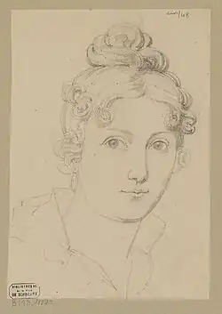 Josefa Bayeu (1747–1812) was Goya's wife from 1773 until her death in 1812. She came from a wealthy Aragonese family with artistic traditions. Her brother was Francisco Bayeu, a painter who supported Goya's career at the royal court. Despite her background, Josefa was most likely illiterate.[2] Xavier de Salas Bosch describes her as naive, good-natured, and foolish.[10] Goya married her for the connections her family had in artistic circles. Little is known about her life alongside the painter. Josefa became pregnant multiple times (perhaps even 20 times) and suffered miscarriages. Only seven of her children survived infancy, and only her son Francisco Javier reached adulthood. Josefa's repeated motherhood was a significant burden for her, both physically and mentally.[2] The artist rarely mentioned his wife in his extensive correspondence, and she was not his model.[11] The only confirmed image of Josefa that has survived to modern times is a small charcoal sketch from 1805 depicting her profile. It shows nearly 60-year-old Josefa as an aged, slightly stooped woman with sagging skin and a tired expression.[8][11] She appears calm, with a hint of melancholy in her eyes. She wears a cap on her head and has a woolen shawl draped over her shoulders.[12] Her physiognomy does not correspond to the delicate features of the young lady depicted in the oil portrait.[8][13]
