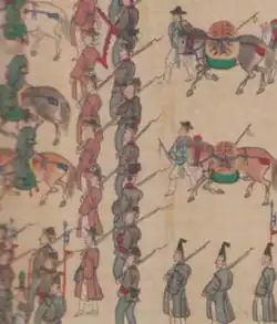 In addition, there were eighty-seven Patrol Enforcers (순령수), forty-four Lantern Troops (등롱군), forty-four Tent Troops (장막군), over two hundred Waiting Troops (대령군), five Five Sentries (초), forty to fifty Firearm Soldiers (화병), around ten Separate Formation Breakers (별파진), over thirty Diversionary Cavalry (복마군), over sixty Gate Guards (수문군), five Grooms (마부), and around fifty Miscellaneous Staff (잡색원).[22][23]