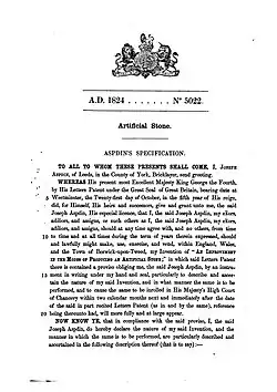 TO ALL TO WHOM THESE PRESENTS SHALL COME, I, Joseph Aspdin, of Leeds, in the County of York, Bricklayer, send greeting. WHEREAS His present most Excellent Majesty King George the Fourth, by His Letters Patent under the Great Seal of Great Britain, bearing date at Westminster, the Twenty-first day of October, in the fifth year of His reign, did, for Himself, His heirs and successors, give and grant unto me, the said Joseph Aspdin, His special licence, that I, the said Joseph Aspdin, my exors, admors, and assigns, should at any time agree with, and no others, from time to time at all time during the term of years therein expressed, should and lawfully might make, use, exercise, and vend, within England, Wales and the Town of Berwick-upon-Tweed, my invention of "AN IMPROVEMENT IN THE MODE OF PRODUCING AN ARTIFICIAL STONE;" in which said Letters Patent there is contained a proviso obliging me, said Joseph Aspdin, by an instrument in writing under my hand and seal, particularly to describe and ascertain the nature of my said invention, and in what manner the same is to be performed, and to cause the same to be inrolled in his Majesty's High Court of Chancery within two calendar months next and immediately after the date of the said part recited Letters Patent (as in and by the same), reference being thereunto had, will more fully and at large appear.
