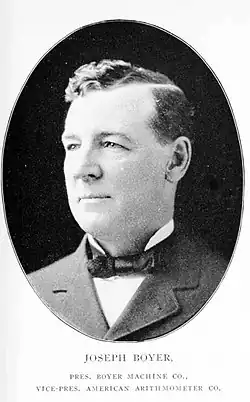 Boyer was President of the J. Boyer Machine Co. in St. Louis, Missouri. He helped William Seward Burroughs I develop the adding machine and was the inventor of the first successful rivet gun. As the third president of the American Arithmometer Company, in the first of a series of business moves designed to eliminate the competition, in 1903 he secretly agreed to acquire the Addograph Manufacturing Company.[3] Then in 1905 Boyer relocated the entire company from St. Louis to Detroit, Michigan at which point the company name was changed to the Burroughs Adding Machine Company. He served as president until 1920.