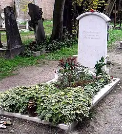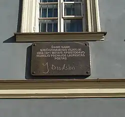 Brodsky died of a heart attack aged 55, at his apartment in Brooklyn Heights, a neighborhood of Brooklyn, a borough of New York City, on 28 January 1996.[12] He had open-heart surgery in 1979 and later two bypass operations, remaining in frail health following that time. He was buried in a non-Catholic section of the San Michele cemetery in Venice, Italy, also the resting place of Ezra Pound and Igor Stravinsky.[12] In 1997, a plaque was placed on his former house in St. Petersburg, with his portrait in relief and the words "In this house from 1940 to 1972 lived the great Russian poet, Iosif Aleksandrovich Brodsky".[31] Brodsky's close friend, the Nobel laureate Derek Walcott, memorialized him in his collection The Prodigal, in 2004.