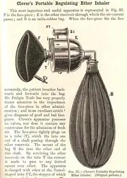 Clover invented his portable ether inhaler in 1877.[9] It was much admired at the time and modified in various ways.[11] It became a common practice at hospitals to initiate all anaesthetic treatments with a mild flow of nitrous oxide and then gradually increase the anaesthesia with a stronger ether or chloroform. Clover's gas-ether inhaler was designed to supply the patient with nitrous oxide and ether at the same time, with the exact mixture being controlled by the operator of the device. It remained in use by many hospitals until the 1930s.[12]