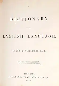 In 1860, Worcester published A Dictionary of the English Language, a substantially revised and expanded work which was soon recognized as a major English language dictionary.[11] The first copies were electrotype printed at the Boston Stereotype Foundry. The dictionary featured numerous illustrations throughout the text, a relatively new innovation. However, Worcester's work was not technically the first American dictionary to feature illustrations. Having heard about the plans for Worcester's new edition, Webster's publishers, George and Charles Merriam, rushed to put out a similar work. They managed to publish a Pictorial Edition of Webster's American Dictionary in 1859. The Pictorial Edition was basically a reprint of the 1847 American Dictionary, with engravings taken from the Imperial Dictionary of the English Language.[12] More competition arrived in the form of the Merriam's revised edition of Webster's American Dictionary, which appeared in 1864. Worcester's dictionary was posthumously revised in 1886, but was eclipsed by Webster's International and other dictionaries of the 1890s.