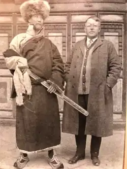 For the first few years based in Lijiang, Rock carried out expeditions mostly in the northern regions of Yunnan sponsored by the National Geographic Society and the Smithsonian Institution. Beginning in Dec. 1924, Rock set off on his most ambitious expedition lasting over three years sponsored by Harvard's Arnold Arboretum. The primary purpose was to collect plant and bird specimens in Gansu province, around Kokonor (Qinghai Lake) and in the Amnye Machen mountain range. For much of this time he based himself in Choni (Jonê County), Gansu as the guest of the prince or chieftain (tusi) of this small Tibetan kingdom, and his explorations included visits to the great Kumbum, Labrang and Rakya Tibetan monasteries. The entire region was wracked by warlordism and ferocious Tibetan-Muslim conflicts. Rock witnessed some of the brutal consequences of the Golok rebellions when the Warlord general Ma Qi's Chinese Muslim army campaigned against the fiercely independent nomadic Goloks and ravaged the Labrang Monastery.[4] Rock finally left Choni in March 1927, but not before acquiring from Choni's famous printing press complete sets of the Kanjur and Tanjur canon of Tibetan Buddhist scriptures, 317 volumes in total, printed from 18th century wood blocks considered among the very finest quality. The following year Choni was sacked, the monastery and its ancient press burnt to the ground in the Muslim conflict in Gansu (1927–1930) by a Muslim army. This was the most important of a number of significant Tibetan texts Rock acquired for the Library of Congress collection.[5]